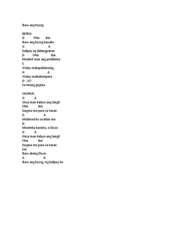 Pupuntahan May karamay nangarap kahit mahirap Lagi kang nandyan Langit ko ay ikaw Halik ng isang anghel Liwanag. Akala Koy Langit Intro G pause VERSE 1 Em At tinangay ka na ng hangin Am G papalayo sa akin Em wala nang iisipin Am G kahibangan koy natapos din REFRAIN 1 Em Bm nasanay na akong magulo ang mundo Em Bm nasanay na akong malayo sayo C Bm Em wala na kahit pa maganda mong alaalang nakakapit C D G pause aalisin ko na. Ikaw lamang ang pupurihin Ang pangalan Mo ay dadakilain Wala Sayong maihahambing Ang awit koy Iyong dinggin.